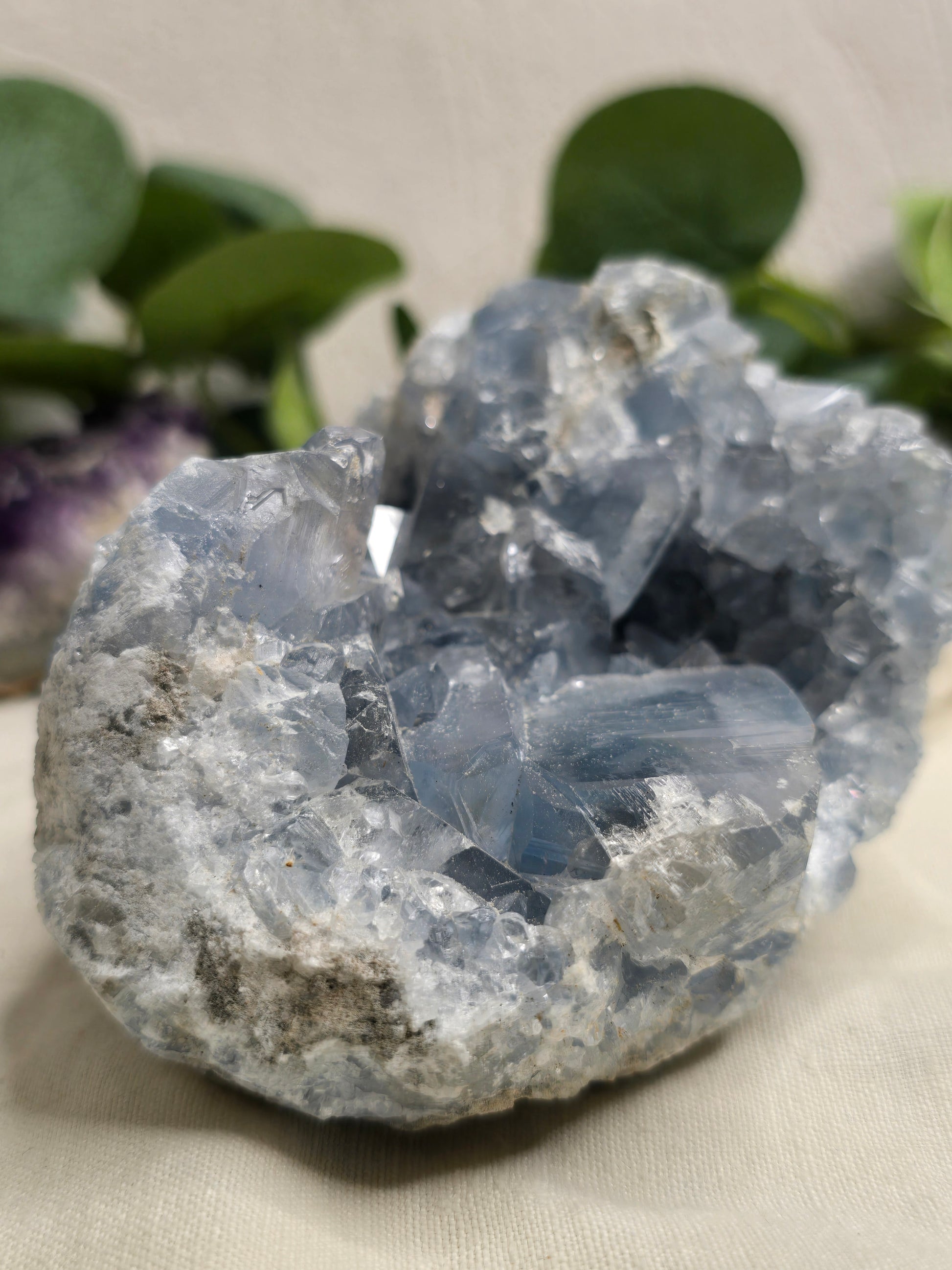 Diese Coelestin-Druse begeistert durch ihre himmelblauen Kristalle, die je nach Lichteinfall sanft schimmern. Mit 856 g Gewicht und den Maßen von 11 × 8 cm ist sie ein eindrucksvolles Stück Natur, das Ruhe und Weite ausstrahlt.