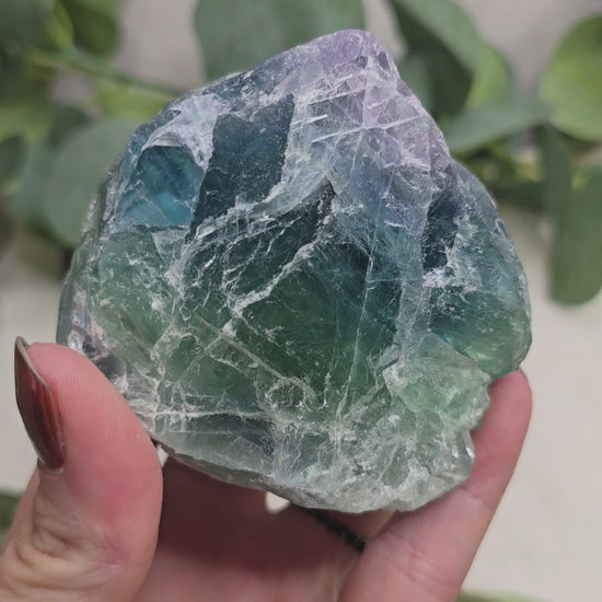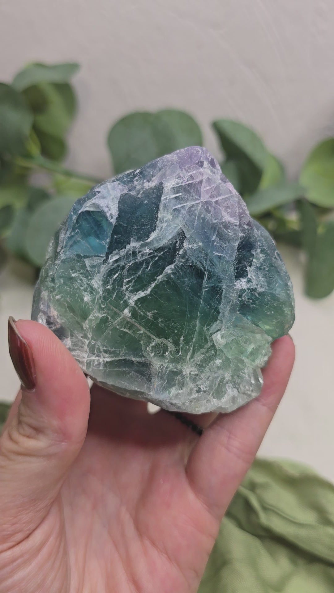 Dieses RohstĂŒck aus Regenbogenfluorit beeindruckt mit krĂ€ftigen GrĂŒn- und Violetttönen, die typisch fĂŒr diesen Edelstein sind. Die naturbelassene Form mit klaren Bruchkanten verleiht ihm einen authentischen Charakter. Mit einem Gewicht von 423 g ist es ein eindrucksvolles StĂŒck, das sowohl in der Sammlung als auch als dekoratives Highlight Wirkung zeigt.