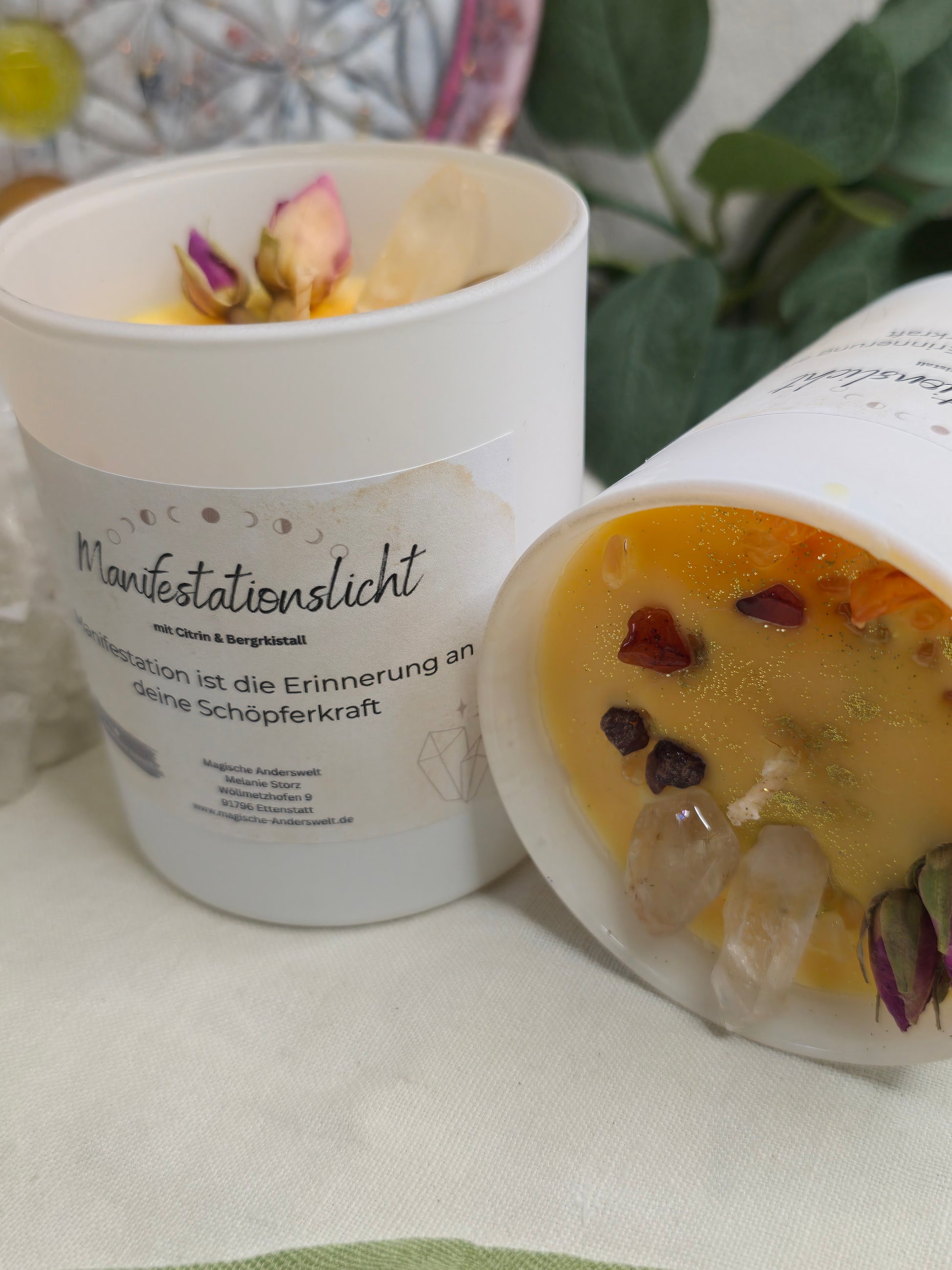 Gefüllt mit ca. 150 ml Wachs in zartem Goldgelb vereint sie kraftvolle Edelsteine, die dich energetisch beim Umsetzen deiner Wünsche und Ziele unterstützen: