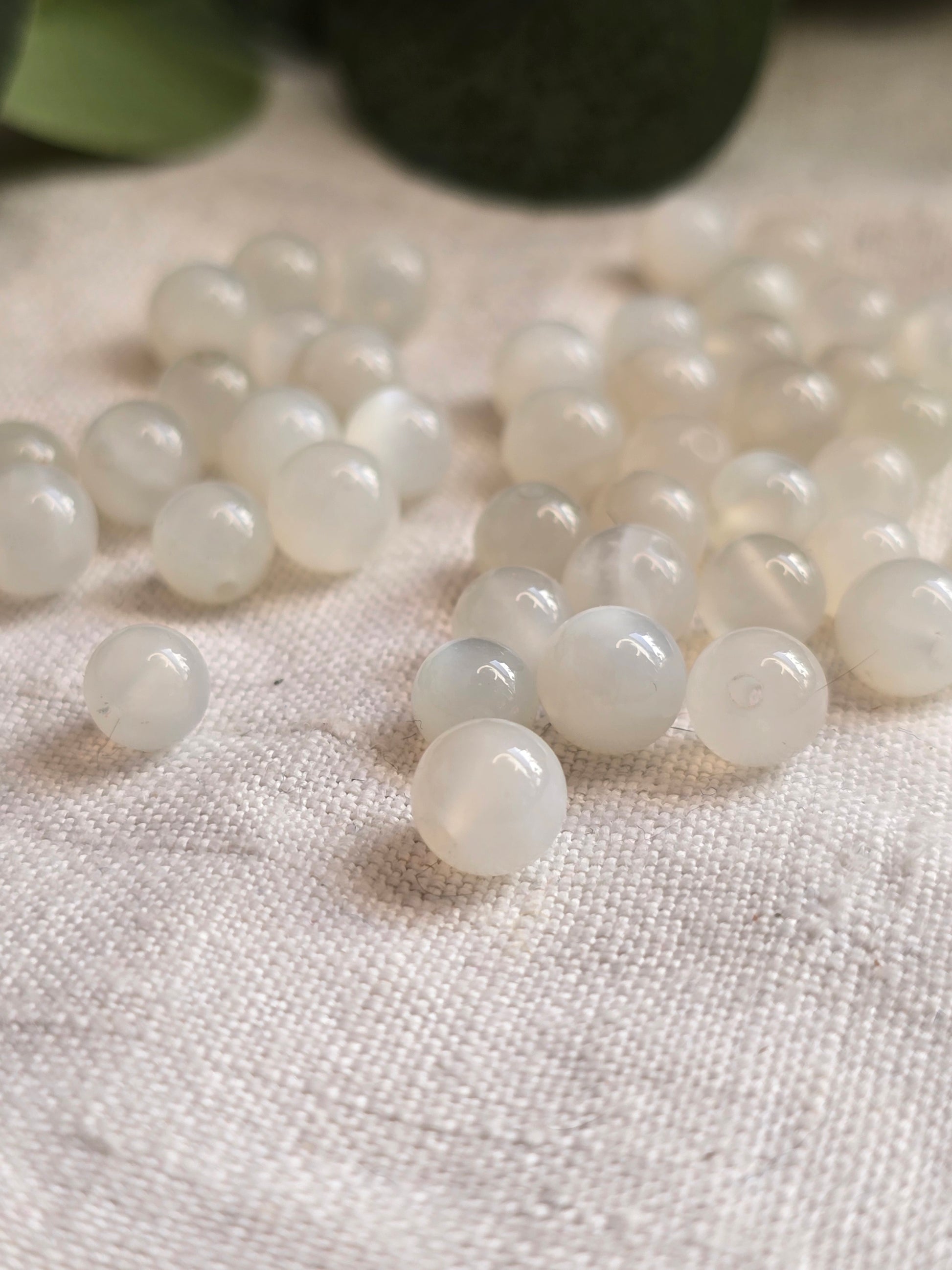 Diese Perlen aus weißem Mondstein mit 6 mm Durchmesser zeigen die typische milchige bis leicht transparente Struktur dieses klassischen Edelsteins. Je nach Lichteinfall kann ein sanfter Schimmer sichtbar werden, der dem Stein seine ruhige, elegante Ausstrahlung verleiht.